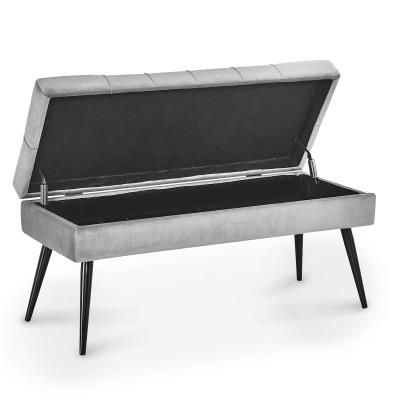 Banquette capitonnée avec coffre de rangement avec base en métal doré et assise confortable en velours bleu.
