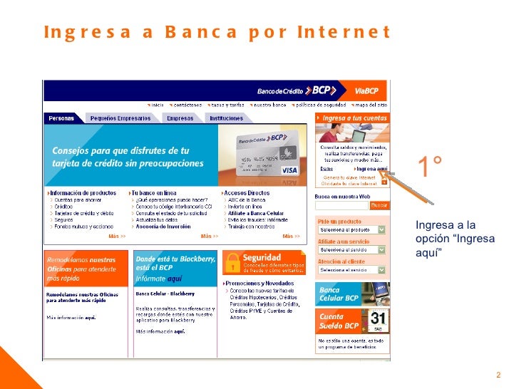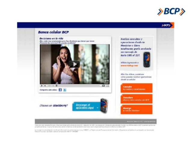 Banco de crédito bcp, dispone más de 450 agencias bcp a nivel nacional, las que brindan atención personalizada sobre créditos, seguros y los pagos por internet igual de seguros y los movimientos serán en tiempo real. Realiza tus transacciones desde la comodidad de tu hogar u oficina. Banca por internet ( bcp ) existen dos conceptos objetivos mayor captacin de publico y el incremento de transacciones va internet.